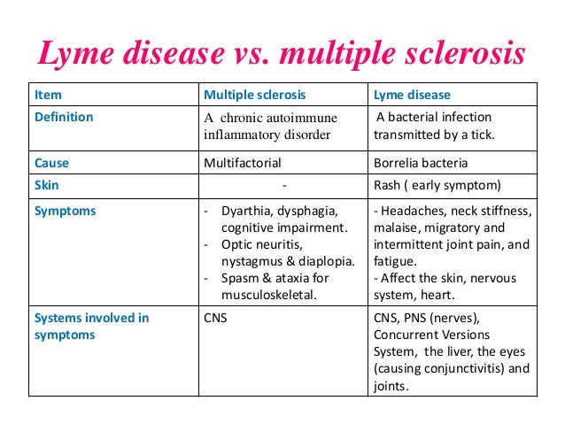 Lyme disease as an infection can act to trigger MS attacks. Lyme is due to an infectious agent a deer tick and ms. What else do people with MS dont have and lymers do. Use of prescription medications corticosteroids and plasma exchange help keep the disease in check. Send thanks to the doctor. Worldwide MS prevalence parallels the distribution of the Lyme disease pathogen Borrelia B burgdorferi and in America and Europe the birth excesses of those individuals who later in life develop MS exactly mirror the seasonal distributions of Borrelia transmitting Ixodes ticks. Lyme Disease and MS. Its important to do a comparison of Lyme disease vs. Multiple sclerosis MS as the two do have much in common.