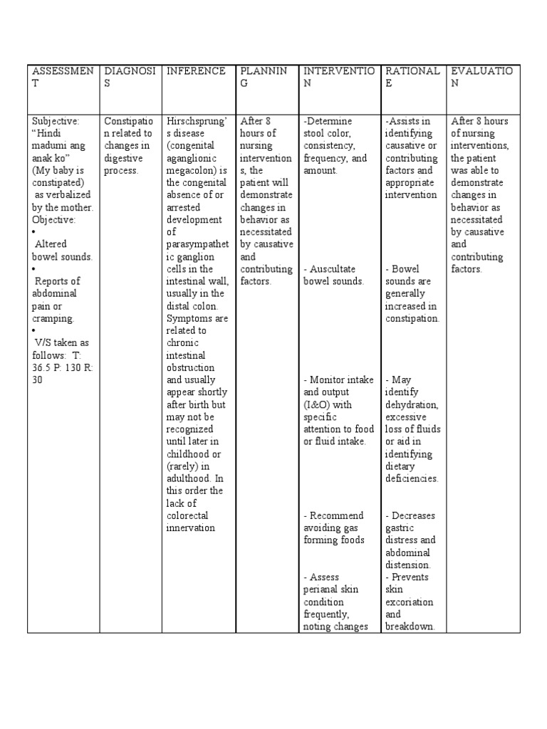 Constipation Hirschsprungs After 8 hours of Determine stool Assists in After 8 hours of related to nursing color identifying nursing Hindi madumi changes in disease interventions interventions consistency causative or ang anak ko My digestive congenital the patient will frequency and contributing the patient was baby is constipated process. Constipation related to an intestinal obstruction. Nursing Care Plan for Hirschsprungs Disease Welcome to Nursing Diagnosis this time I will give information about the world namely the Nursing Care Plan for Hirschsprungs DiseaseI will present information about the Nursing Care Plan for Hirschsprungs Disease.