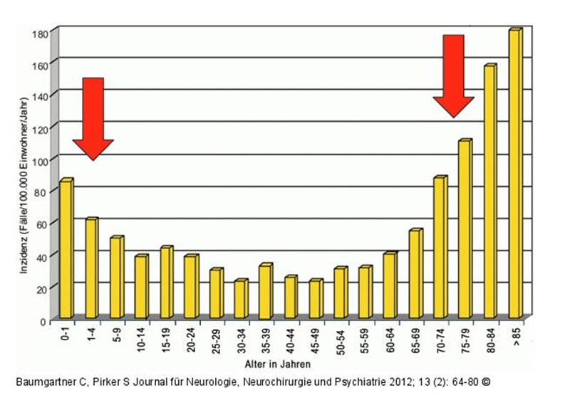 Das klinische Erscheinungsbild epileptischer Anfälle im Alter unterscheidet sich gegenüber jüngeren Patienten. Anhand von epidemiologischen Untersuchungen wurde aber inzwischen deutlich dass Epilepsien am häufigsten im Alter über 75 Jahre auftreten 1 2 Grafik 1 gif ppt. Ursachen für die Epilepsie im Alter können unter anderem Kopfverletzungen kleine Schlaganfälle beginnende Demenz Alkohol-Missbrauch oder Entzündungen sein.