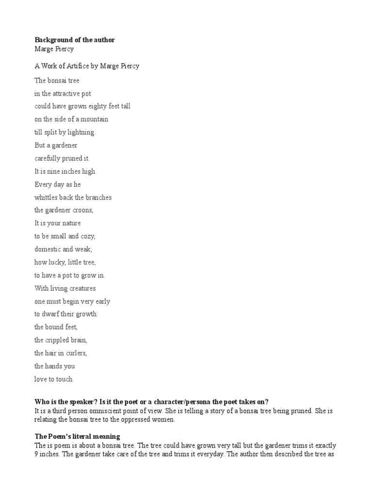 A dead bonsai tree. It is derived from the purchase of a bonsai tree which was given to her for her birthday. At first when you read the poem. This hold of social customs on women is so strong that releasing them will require fierce force and empowerment. In front of the brick house. Using a bonsai tree as an extended metaphor in her poem A Work of Artifice Marge Piercy comments on the manner in which women are regarded by society. The poem Bonsai by Edith Tiempo is about love and how people imbue certain objects with love for a person and those objects become the symbol of love.